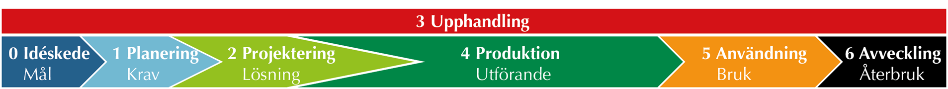 | Upphandlingsskede | 3 | Upphandling | process som syftar kontraktera leverantör av byggvara och/eller byggresultat Not: Planering, projektering, produktion, drift och underhåll åstadkommer byggresultat. | anbudsförfrågan, kalkylering, anbudsgivning, värdering, accept, inköp, försäljning | förfrågningsunderlag, offert, anbud, upphandlingsbeslut, avtal, ramavtal |